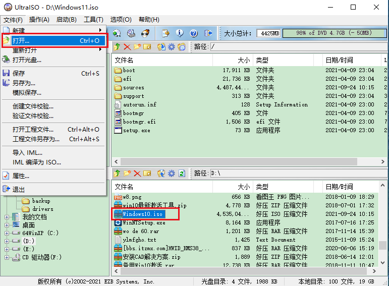 1、准备好win10 iso系统镜像,然后在电脑上插入U盘,以管理员身份运行UltraISO软碟通制作工具,依次点击“文件”—“打开”;