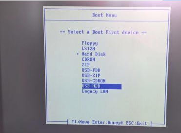 在想安装系统的电脑上插入此U盘,然后开机,在屏幕亮起后按Delete或F12进入引导菜单,用键盘上的方向键向下选择"USB-HDD"并单击回车键,系统会被U盘引导并开始安装新系统。